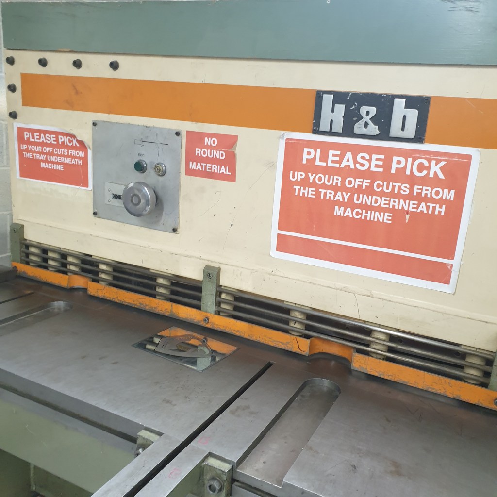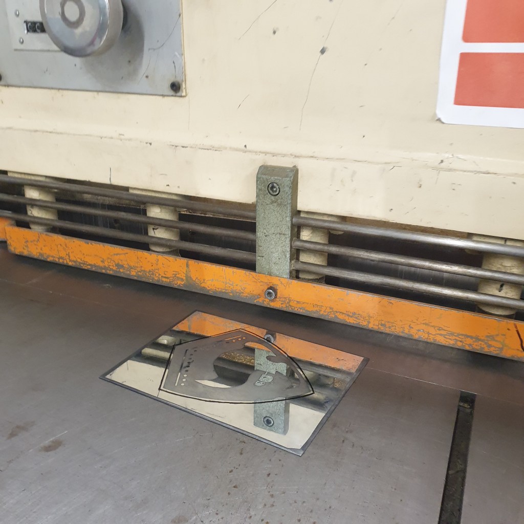 Since the symbol was etched onto a rectangular plate, we then had to head down to the metal workshop and cut the symbol into the FBI Badge shape. First, we used a metal guillotine to cut off the excess metal before sanding down into a more rounded shape.