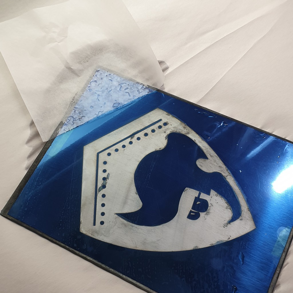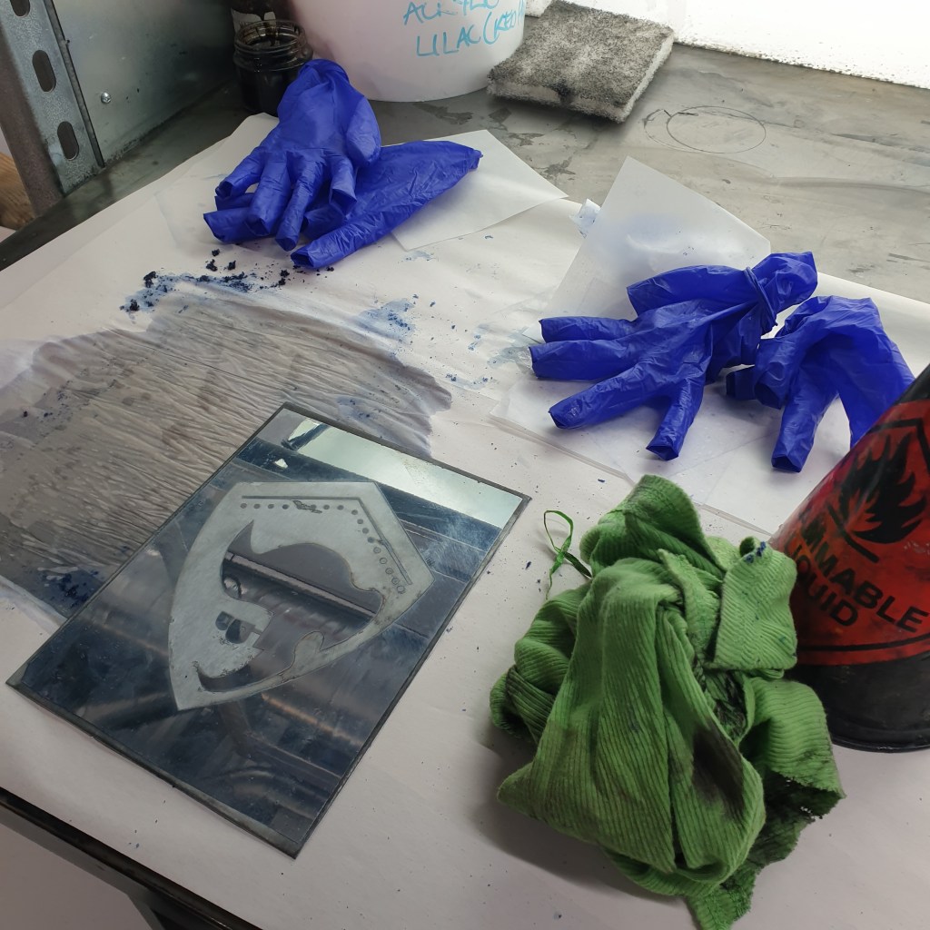 We began by re-drawing our symbol on Adobe Illustrator in order to transfer the image onto the zinc plate. Redrawing the symbol in Illustrator enabled us to get the symbol as accurate as we could and perfect the smaller details. After this was done, we saved the file as a PDF and the technicians in the print workshop transferred it onto the plate in the darkroom and then exposing to UV light. Next, we prepared the Copper Sulphate bath and left the zinc plate in the bath for around an hour. The Copper Sulphate etched away at the parts of the plate which were exposed to light. We then removed the plate from the bath and poured some acid to help dissolve the blue film that protected other parts of the plate from being etched. After 10 minutes, the blue film began to bubble and we were able to wipe it off using an old, clean rag. Finally, we rinsed the plate in water and then used Brasso to polish it up.