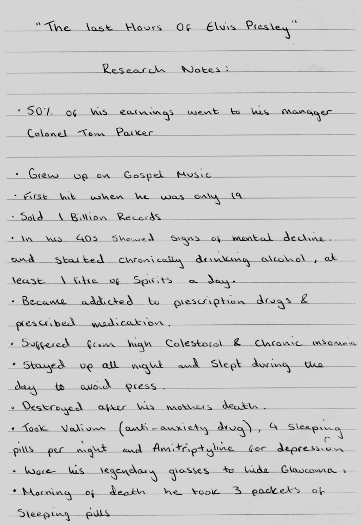 From our notes, we understood that Elvis was a very unhappy man in the few years leading up to his death. We learnt that a vicious spiral of drug and alcohol addiction wasn’t the cause of his death, but did play a part. Around the time of his “arrest”, Elvis’ mental deciline had begun, but was was somewhat under contol. We also found out that the early 1070’s were big for Elvis. He had many shows and broke his atendance records. He had divorced with Priscilla and had returned to the top of the music charts. As for inconography, we dicovered that his famous, oversized glasses were worn to conceal his Glaucoma. By watching this documentary, we have gained some general knowledge on Elvis which has helped us visualise his character a little better.