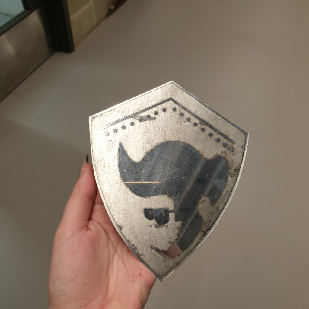 We spoke to the technicians in multiple workshops to see how we can make the buckle. We first thought that our best option would be to Laser Cut the design on wood and spray paint it gold or silver. After speaking with the technicians in the wood and metal workshops, we chose that metal would be our best option. The technician in the metal workshop advised us to go into the printmaking workshop and acid-etch our design onto a metal plate, then he would assist us in cutting the badge/buckle to shape.
