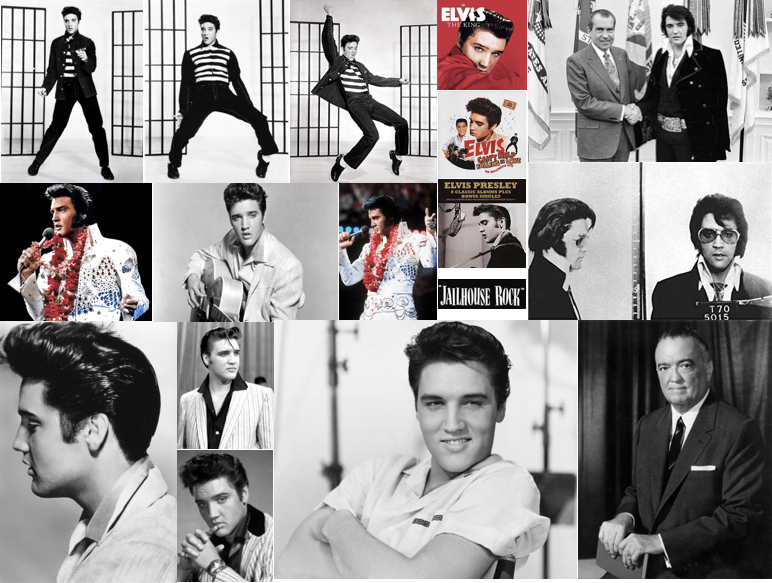 To begin, me and my partner Katie have created a mood board of Elvis to gain a better understanding of his iconography. We have looked at his general aesthetic as a starting point. By doing this, we have recognised that Elvis has been widely recognised for his iconic dance moves and fashion, including his hair, stage costumes and glasses.