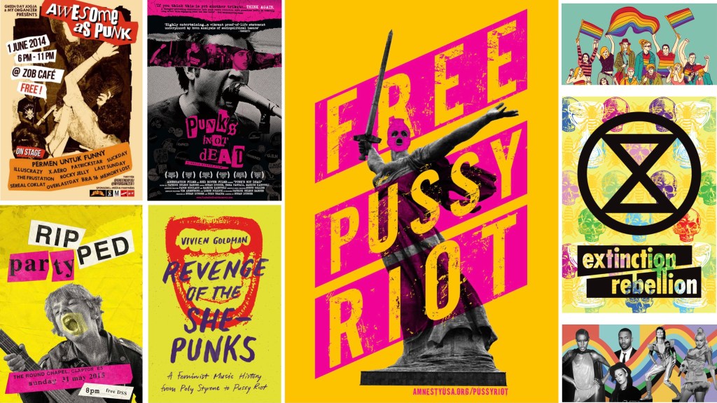 Personally, I felt that with the tone of voice of the brand, and taking into consideration our demographic, bright and bold, anarchist style visuals would be most effective. As I have explained previously, our audience members are passionate and involved in social justice, empowerment and positive change. Looking at movements like extinction Rebellion and Free Pussy Riot, bold colours and a punk feel seem to be quite effective, and, look awesome!