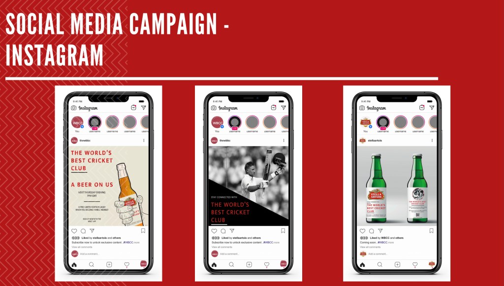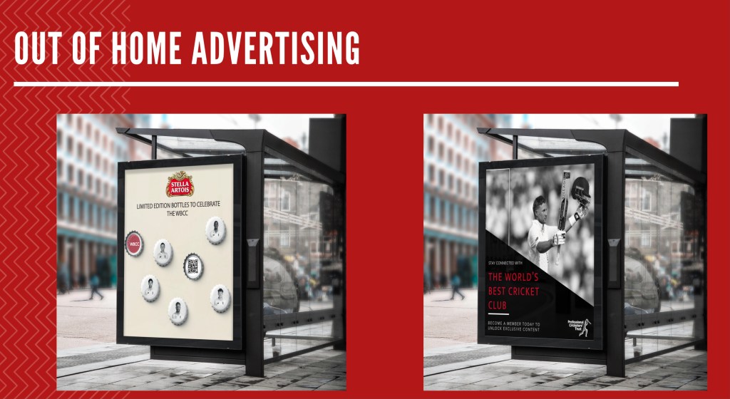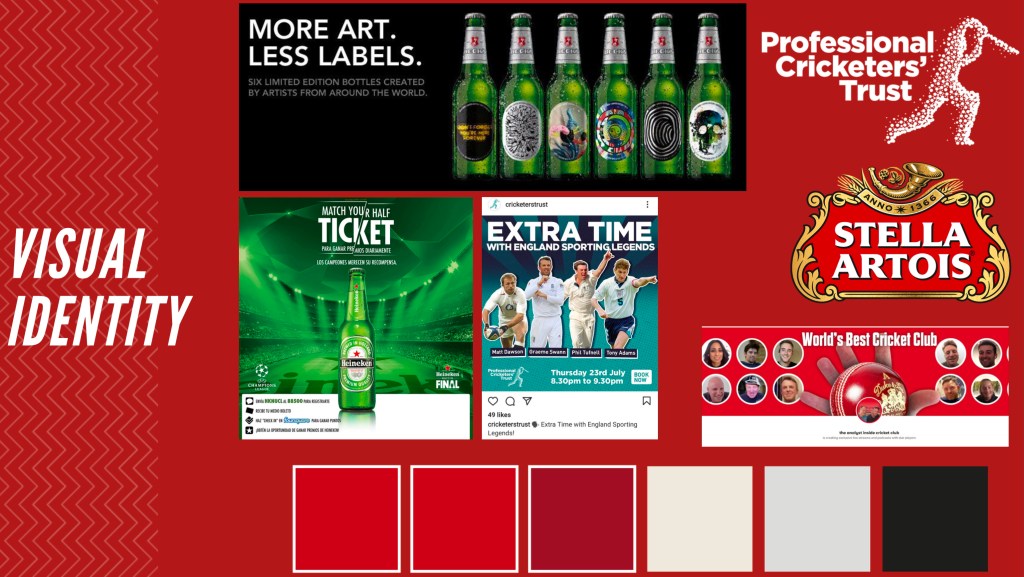 For our visual identity, we looked at the partnership between Heineken and the Champions League, BT sports and the PCT. Our main inspiration however, came from the current visual identity of the WBCC. The World’s Best Cricket Club uses red and white, and so does the visual identity of Stella Artois. From looking at the colours both companies use, we were able to develop our own colour pallet to use for our campaign.