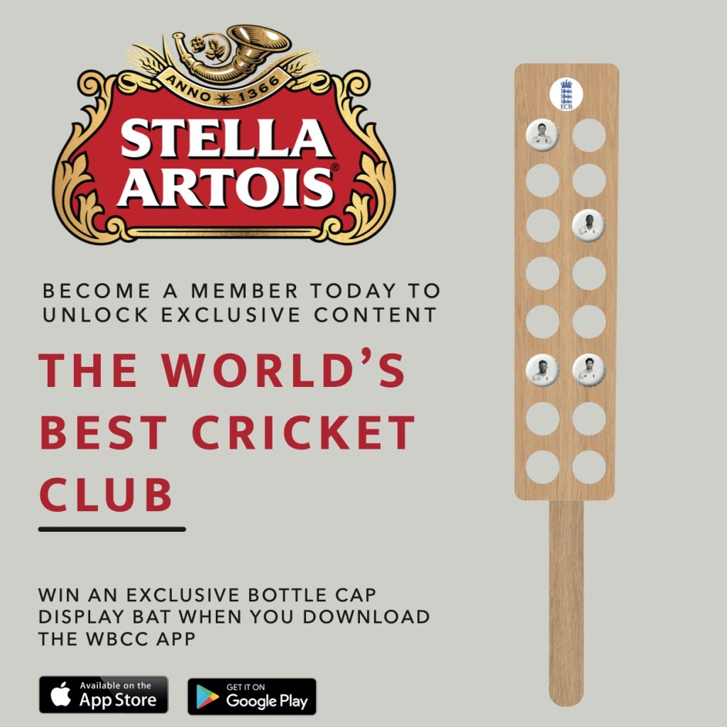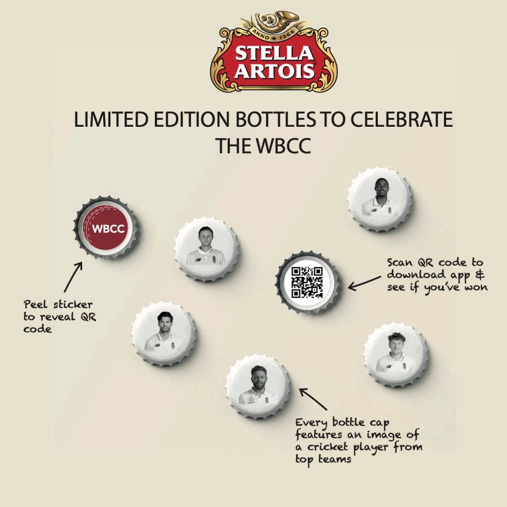 Each bottle is topped with a collectable bottle cap, each featuring an image of a cricket player from top teams. The underside of each cap has a QR Code you can scan to download the WBCC App, and some will have the WBCC logo stuck to the bottom. Should your cap have the logo, you are the winner of a special, limited edition cricket bat to display your collectable WBCC+Stella Artois bottle caps. Examples for which are shown below.