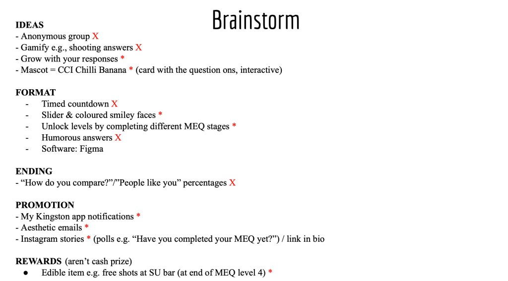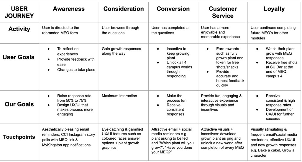 Essentially, our idea was for students to grow a plant through responding to the MEQ’s. With each MEQ, their plant would grow, and they would win a free shot at the KU Bar after completion.