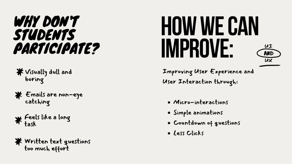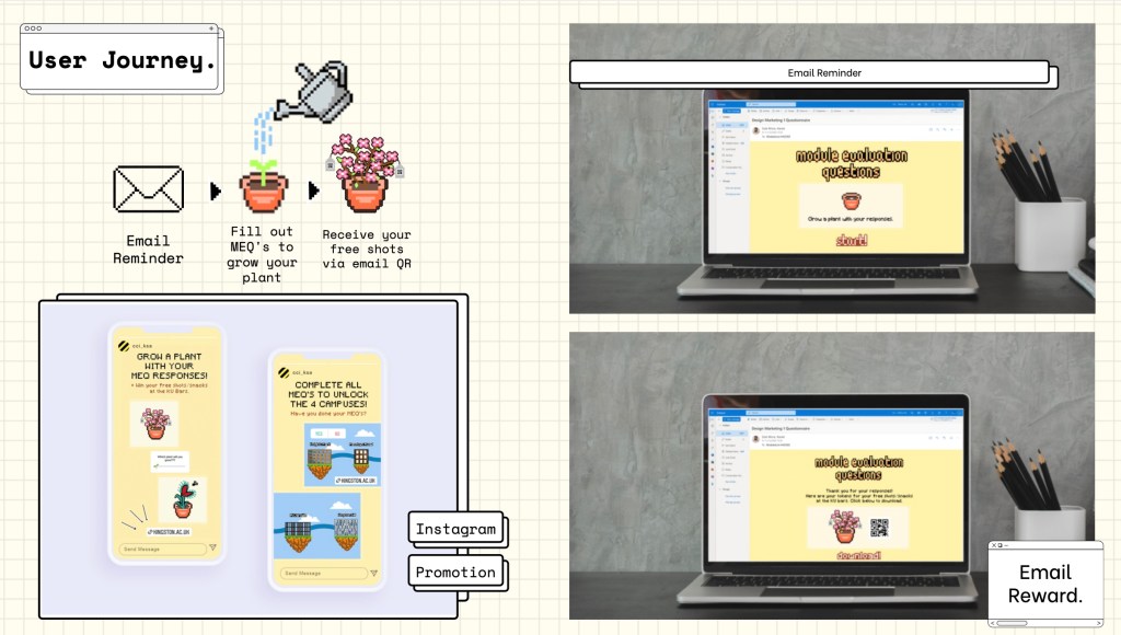 Overall, I think our idea was fun, bright and eye-catching. The reward system we created, would definitely prompt more students to participate and give feedback. Our idea of growing a plant sounded good in theory, but looking back at our prototype, I feel that it doesn’t work well. As a whole, I feel that we had too many touchpoints and should have focused on one or two instead. Due to this reason, I decided to improve this brief further.
