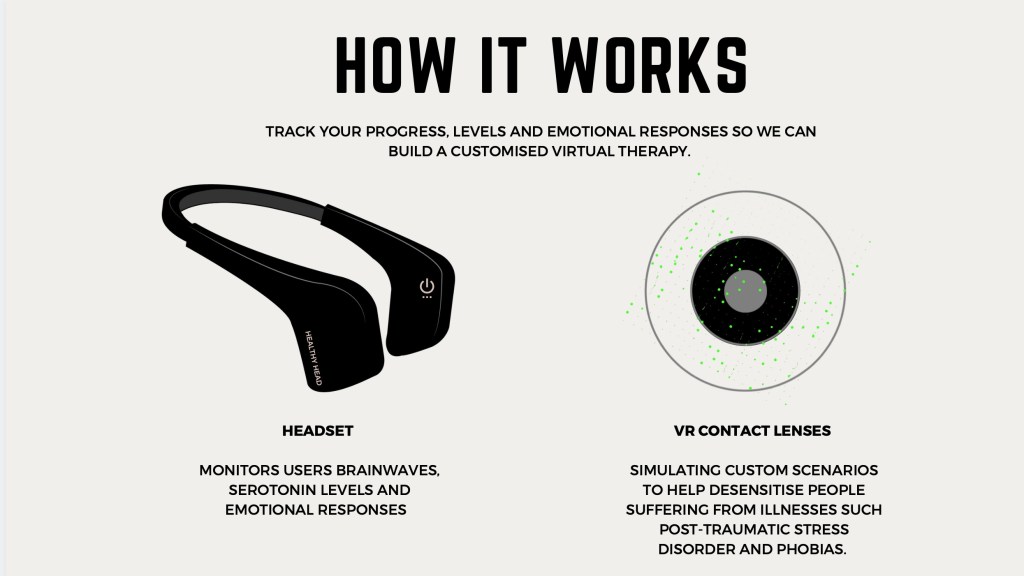 My answer is to use technology to help, support and diagnose mental health conditions from home. Essentially, I am designing a Headset that monitors brain waves, serotonin levels, and emotional responses. From this, a Virtual Reality contact lens simulates custom scenarios to help desensitise people to events/circumstances/situations which would trigger an intense emotional response. This kind of technology could not only be useful to people with mental health disorders, but could also help with the rehabilitation of criminals, addicts, and more.