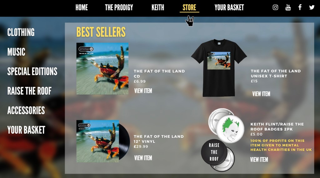 On this page, is information about Keith, as well as Information about the Raise The Roof Campaign and information about mental health. In addition, I created a hypothetical tribute to honour Keith and the 25th Anniversary of The Fat Of The Land, offering 10% of every Fat Of The Land merchandise sales to be given to mental health charities. This will particularly appeal to current, old and loyal fans, and gives customers a “Feel Good” feeling. In the Store mockup below, I also created official “Raise The Roof” merchandise.