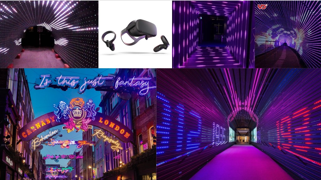 The Virtual reality experience can be accessed with or without the use of VR headsets, in order to be accessible to everyone. The experience is essentially a lyric video, where the user enters a neon tunnel and is surrounded by the lyrics of the song they have selected.