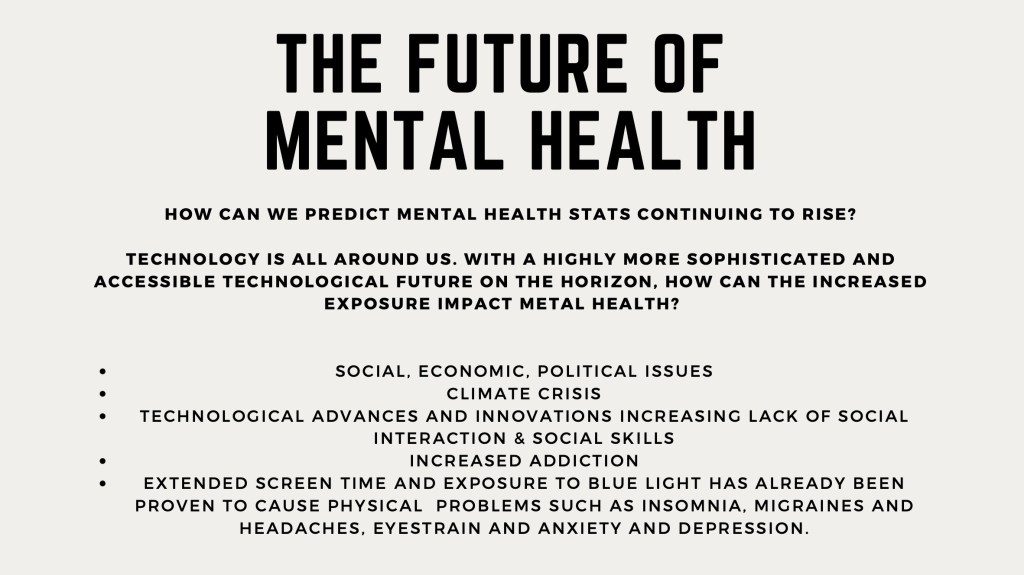 The link between mental health and social media/technology has already been proven to have a negative affect on people’s mental and physical health. Extended screen time has been proven to cause anxiety and depression due to social isolation and the loss of effective social skills. As well as problems with sleep, migraines and eye strain.
